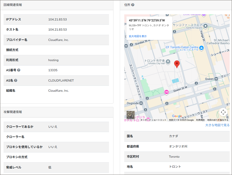 「IP調査兵団」でこのIPアドレスからそのロケーション地域を調べると、詐欺サイト設置場所は、カナダのトロント市庁舎付近であることが分かりました。