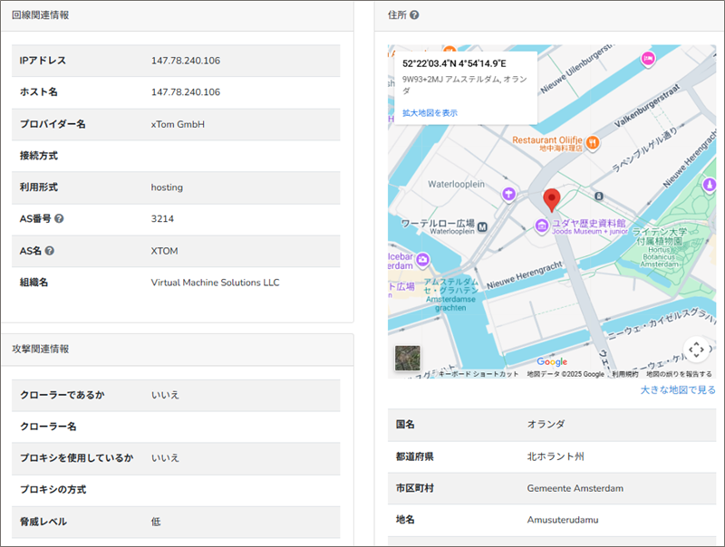 このReceivedフィールドの末尾にあるIPアドレスからメールの発信地を「IP調査兵団」で導き出してみると、オランダのアムステルダム付近です。