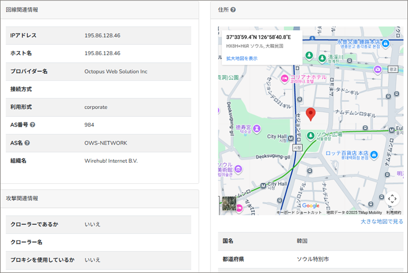 「IP調査兵団」でこのIPアドレスからそのロケーション地域を調べると、韓国のソウル付近であることが分かりました。