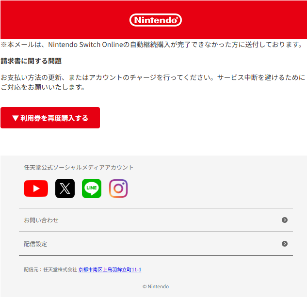 ※本メールは、Nintendo Switch Onlineの自動継続購入が完了できなかった方に送付しております。