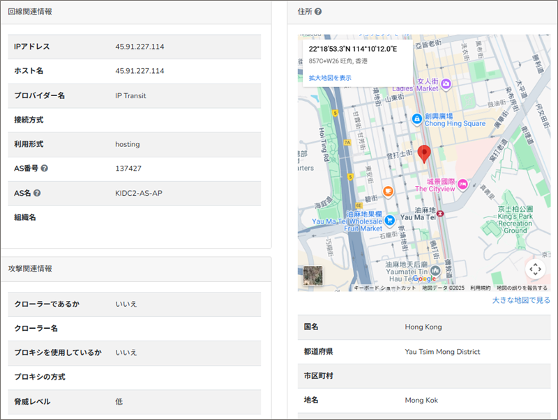 このReceivedフィールドの末尾にあるIPアドレスからメールの発信地を「IP調査兵団」で導き出してみると、香港付近です。