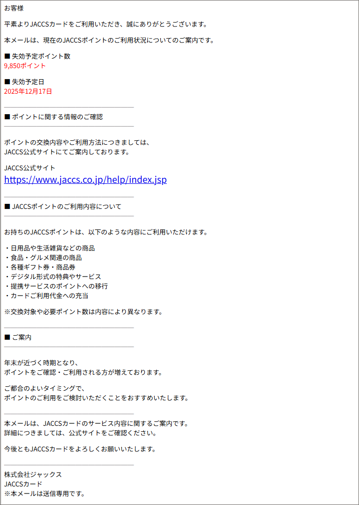 件名に「JACCSポイント残高のご案内No.199066」という具体的な番号があるにも関わらず、本文には失効予定ポイントのみで具体的な現在のポイント残高の記載がありません。