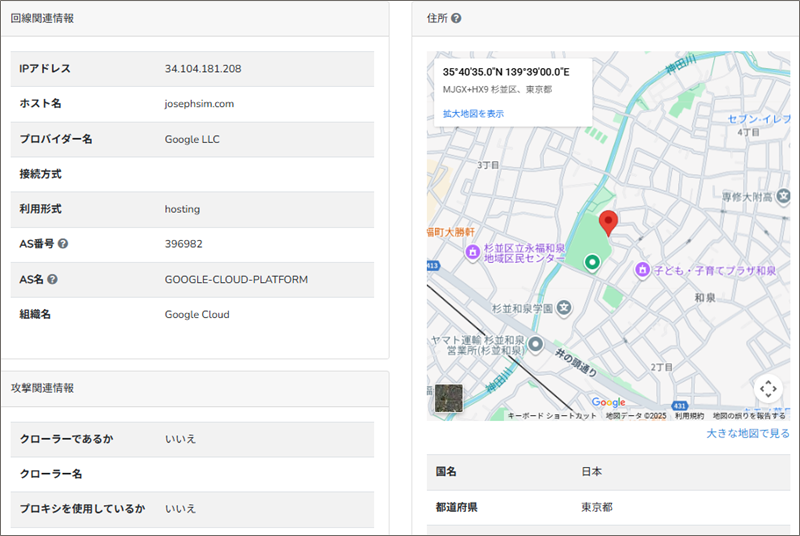 このReceivedフィールドの末尾にあるIPアドレスからメールの発信地を「IP調査兵団」で導き出してみると、東京都杉並区付近です。