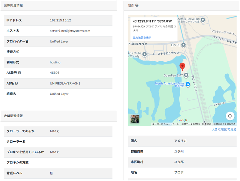 「IP調査兵団」でこのIPアドレスからそのロケーション地域を調べると、今度は米国のプロボ付近であることが分かりました。