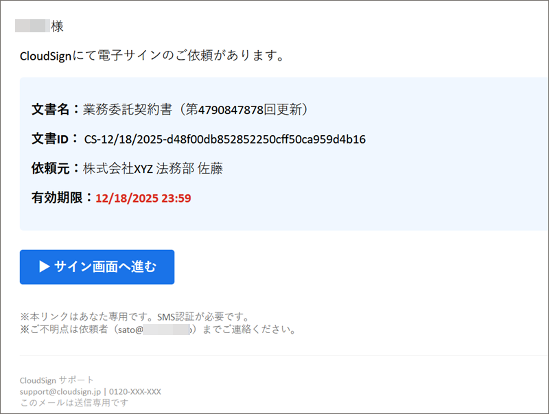 件名:[spam] 【要対応】株式会社XYZより電子サインのご依頼(文書ID: CS-12/18/2025-6ac7c9ac8ff86da4acd9c7b4a774b008634366d0