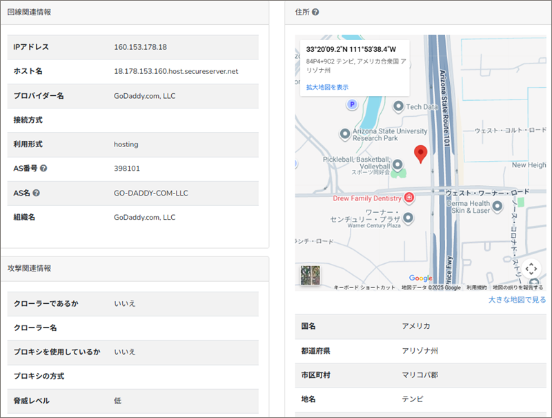 このReceivedフィールドの末尾にあるIPアドレスからメールの発信地を「IP調査兵団」で導き出してみると、米国のテンピ付近です。