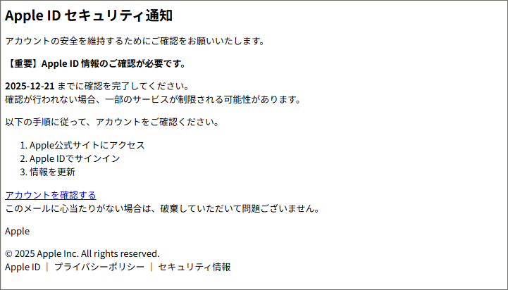 因みにこのメールが送信したとされるタイムスタンプは「送信日時 2025年12月21日(日) 19:59:30」で確認期限として書かれているのは「2025-12-21」で当日です。