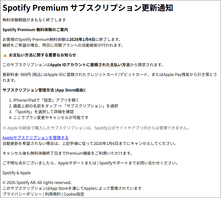 『詐欺メール』Appleから『【重要】Spotify Premium サブスクリプション更新通知』と、来た件