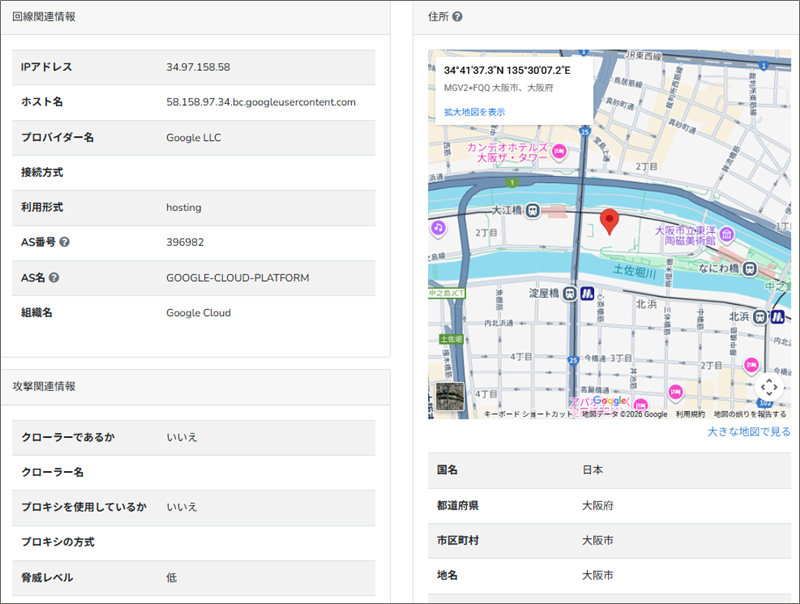 このReceivedフィールドの末尾にあるIPアドレスからメールの発信地を「IP調査兵団」で導き出してみると、大阪市役所付近です。