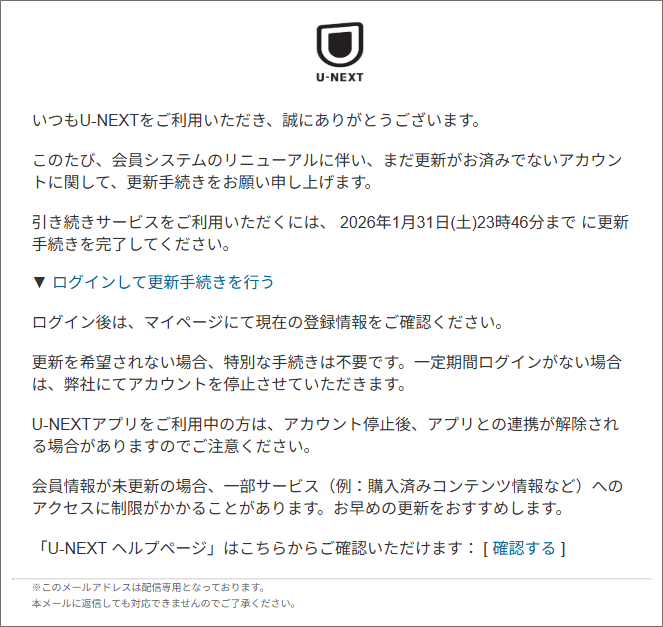 12月にボクシングの興行があり、その中継が U-NEXT での無料配信だったので1か月間の無料期間を使ってユーザー登録を行ったのですが、そのU-NEXTから会員情報を更新するようにメールが届きました。