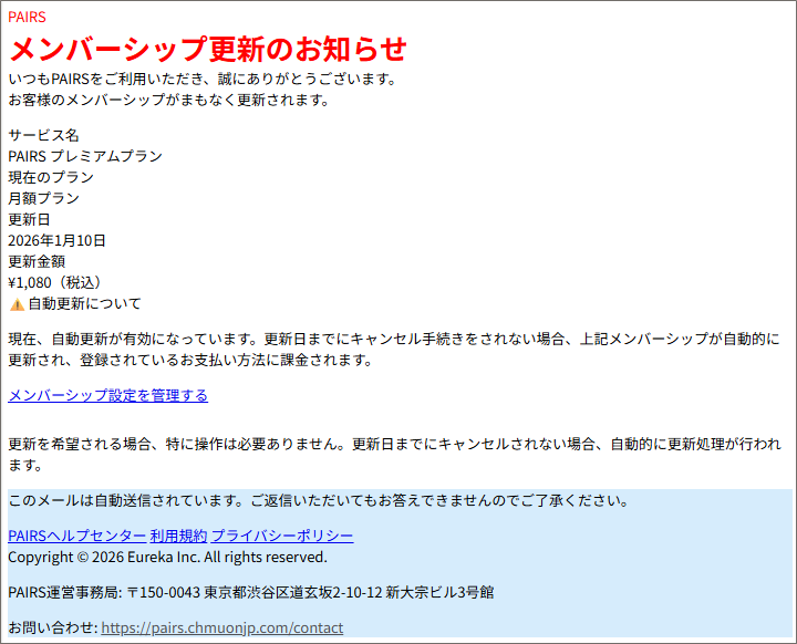 月額 ¥1,080(税込)と書いてありますが、 Pairs の料金体系は 性別・決済方法で異なるため、一律で断定する通知は不自然。 - 不安を煽る典型的な文面