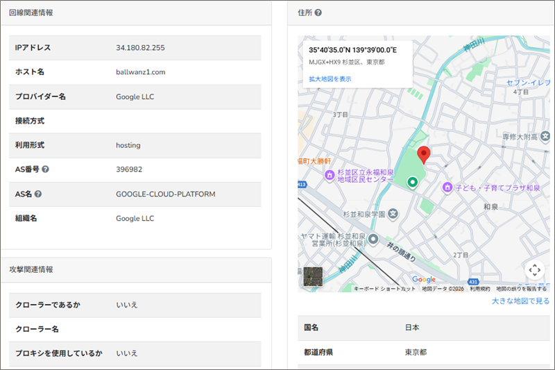 このReceivedフィールドの末尾にあるIPアドレスからメールの発信地を「IP調査兵団」で導き出してみると、東京都杉並区付近です。