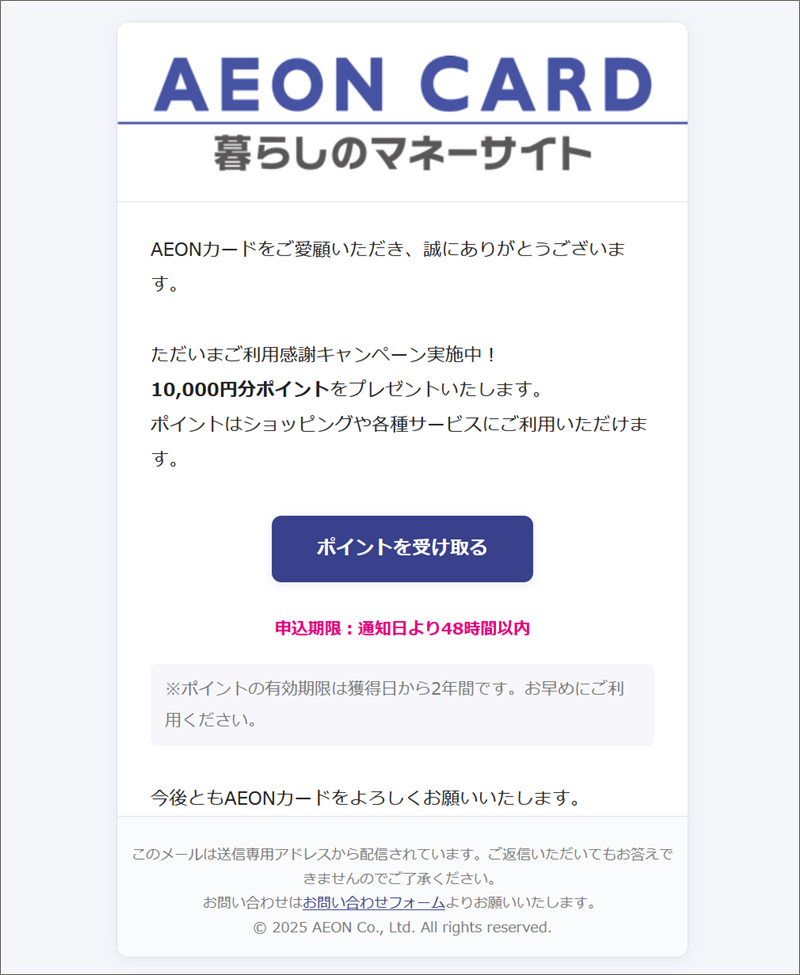 確かに「vinx.co.jp」もイオンのグループ会社のドメインですが、カード会員向けのポイント進呈通知に使われるのは極めて不自然です。 - 「今だけ」「48時間以内」など強い煽り