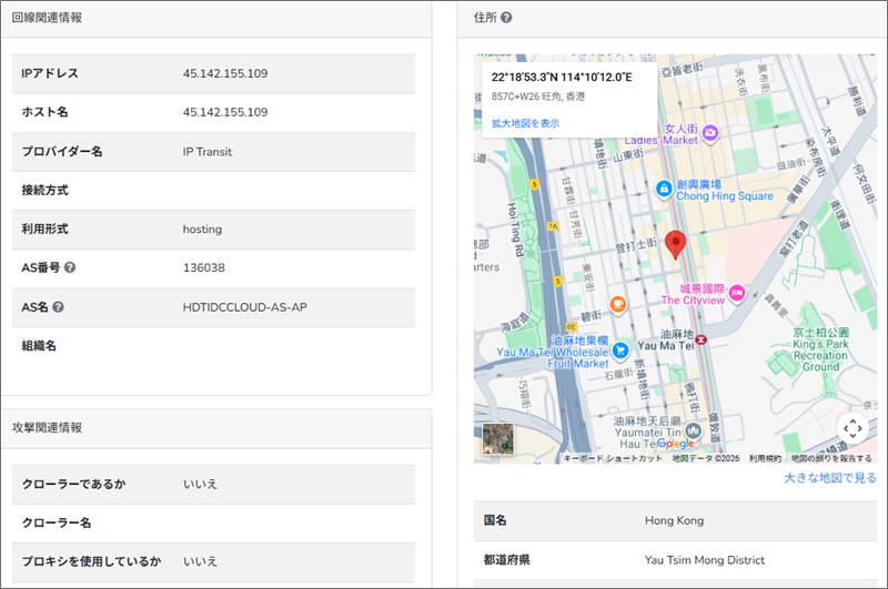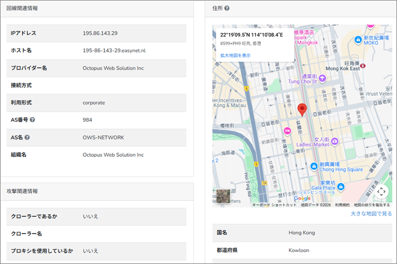 「IP調査兵団」でこのIPアドレスからそのロケーション地域を調べると、先程とは異なるものの再び香港付近であることが分かりました。