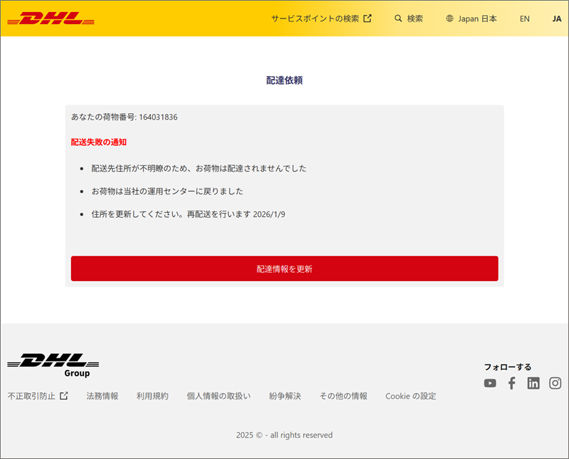 『詐欺メール』DHLから『お荷物再配達のご案内 / Shipment Re-Delivery Reminder』と、来た件