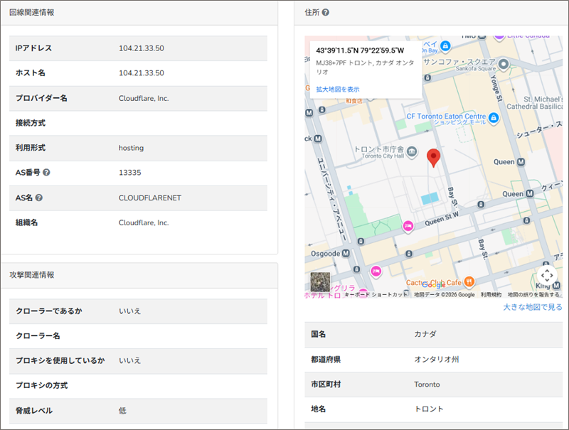 「IP調査兵団」でこのIPアドレスからそのロケーション地域を調べると、詐欺サイト設置場所は、カナダのトロント市庁舎付近であることが分かりました。