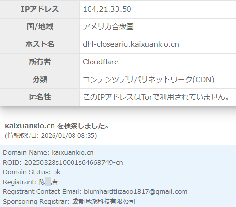 ご覧の通り DHL のドメインとは異なるものが利用されていますから、このサイトは公式サイトではありません!