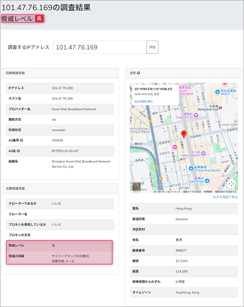 このReceivedフィールドの末尾にあるIPアドレスからメールの発信地を「IP調査兵団」で導き出してみると、香港付近です。