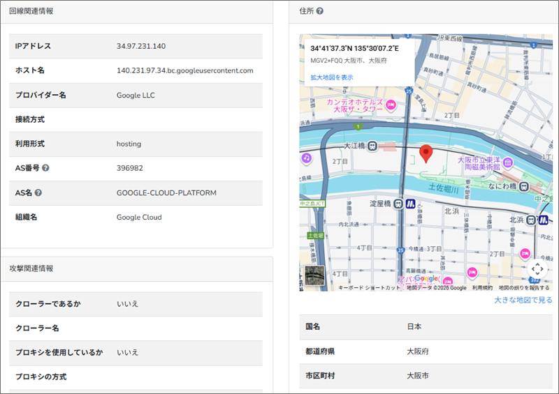 このReceivedフィールドの末尾にあるIPアドレスからメールの発信地を「IP調査兵団」で導き出してみると、大阪市庁舎付近です。