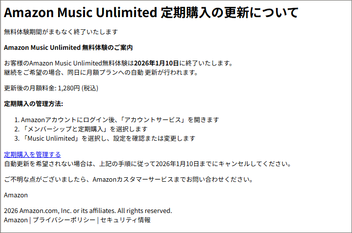 お客様のAmazon Music Unlimited無料体験は2026年1月10日に終了いたします。