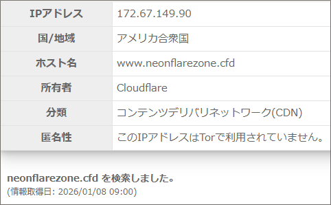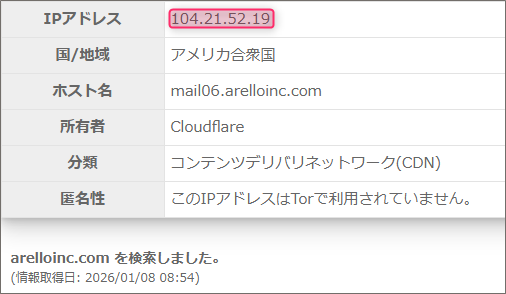 では、試しに眉唾っぽいこのドメイン「mail06.arelloinc.com」を割当てているIPアドレスとカッコ内のIPアドレスを比較してみましょう。