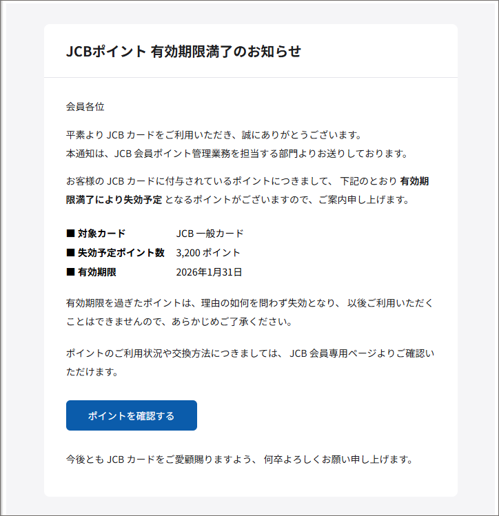 本通知は、JCB 会員ポイント管理業務を担当する部門よりお送りしております。