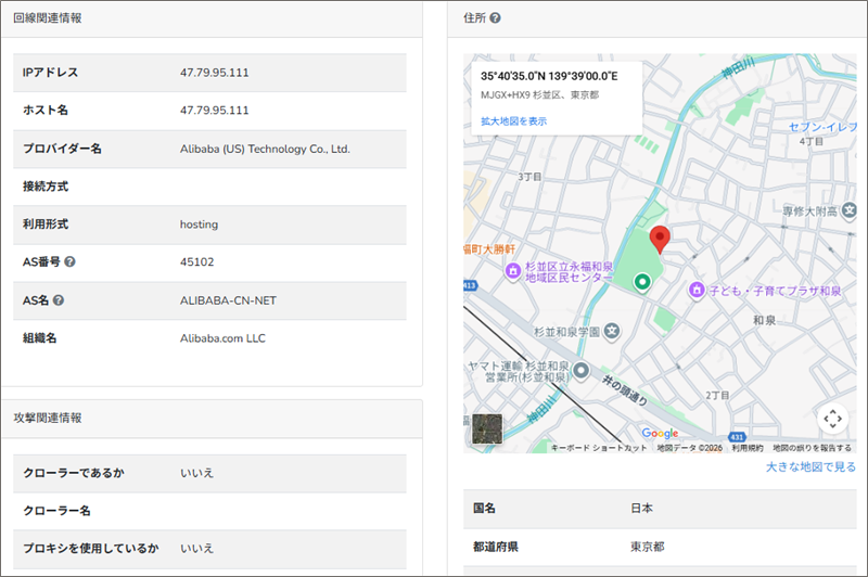 「IP調査兵団」でこのIPアドレスからそのロケーション地域を調べると、詐欺サイト設置場所は、東京都杉並区付近であることが分かりました。