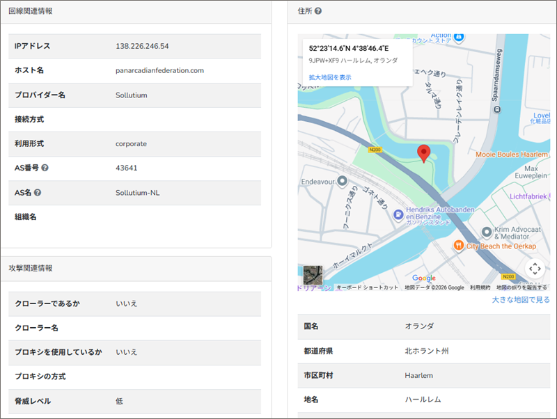 このReceivedフィールドの末尾にあるIPアドレスからメールの発信地を「IP調査兵団」で導き出してみると、オランダのハールレム付近です。