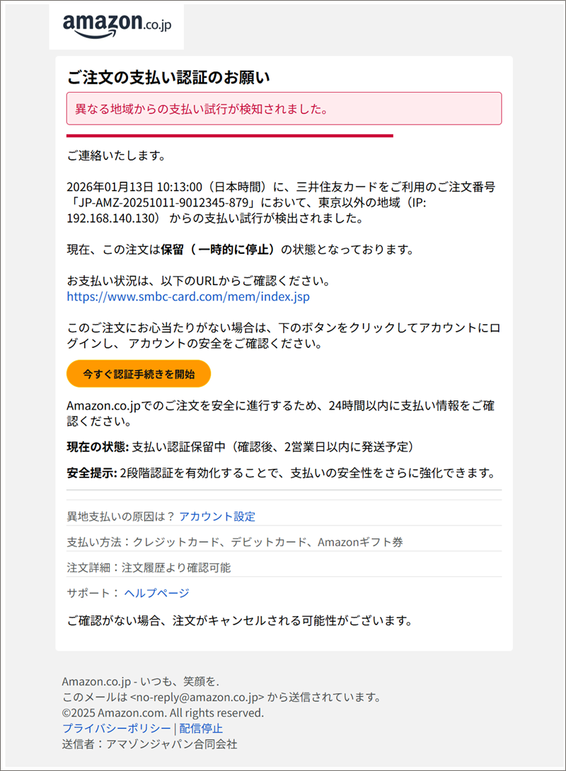 2026年01月13日 10:13:00(日本時間)に、三井住友カードをご利用のご注文番号 「JP-AMZ-20251011-9012345-879」において、東京以外の地域(IP: 192.168.140.130) からの支払い試行が検出されました。