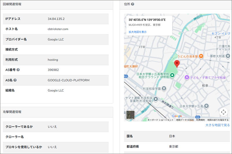このReceivedフィールドの末尾にあるIPアドレスからメールの発信地を「IP調査兵団」で導き出してみると、東京都杉並区付近です。