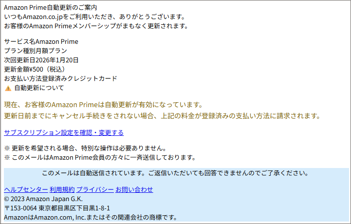 お客様のAmazon Primeメンバーシップがまもなく更新されます。