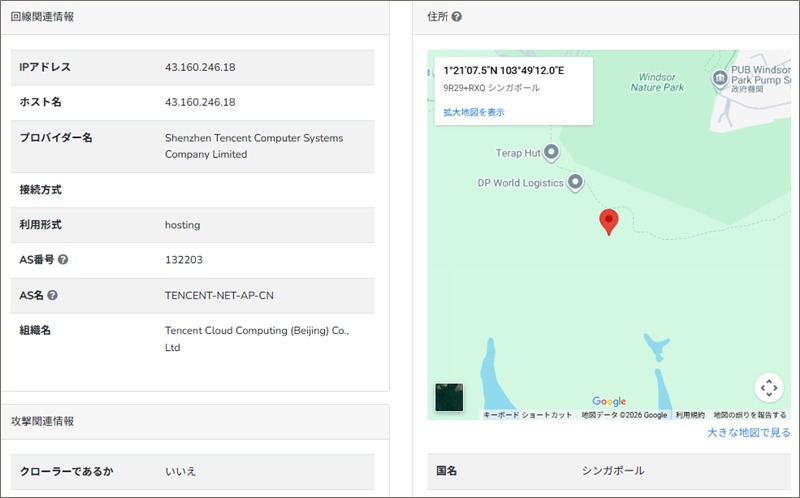 「IP調査兵団」でこのIPアドレスからそのロケーション地域を調べると、詐欺サイトではありがちなシンガポール山中であることが分かりました。