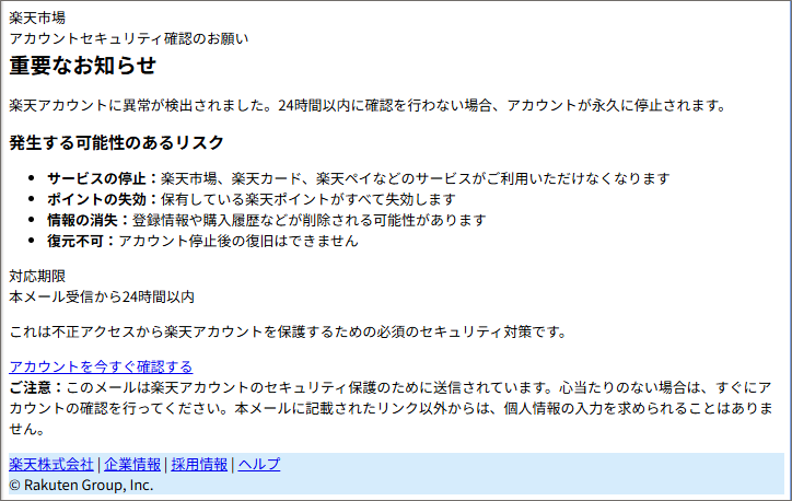 ユーザーを慌てさせて冷静な判断を失わせる表現は、典型的な詐欺の手口で、楽天がこのような脅迫的表現をすることはありません。