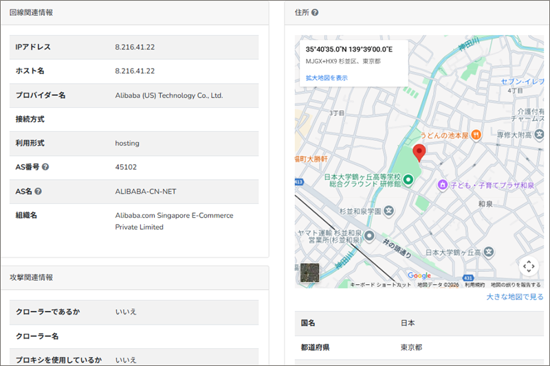 IP調査兵団」でこのIPアドレスからそのロケーション地域を調べると、詐欺サイトではありがちな東京都杉並区付近であることが分かりました。