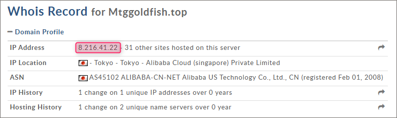 このドメインを割当てているIPアドレスを「whois.domaintools.com」さんで取得してみます。