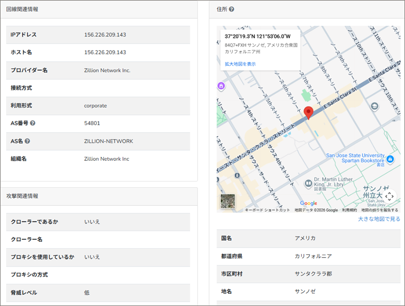 このReceivedフィールドの末尾にあるIPアドレスからメールの発信地を「IP調査兵団」で導き出してみると、米国のサンノゼ付近です。