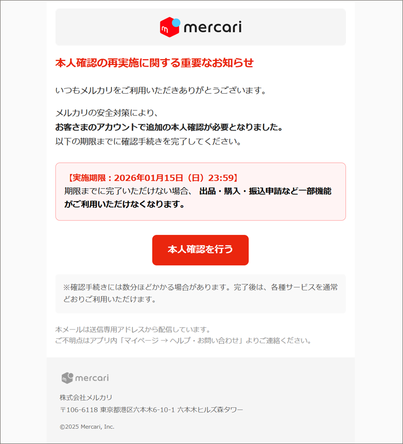 件名:[spam] 【メルカリ】本人確認の再実施に関する重要なお知らせ【yama】