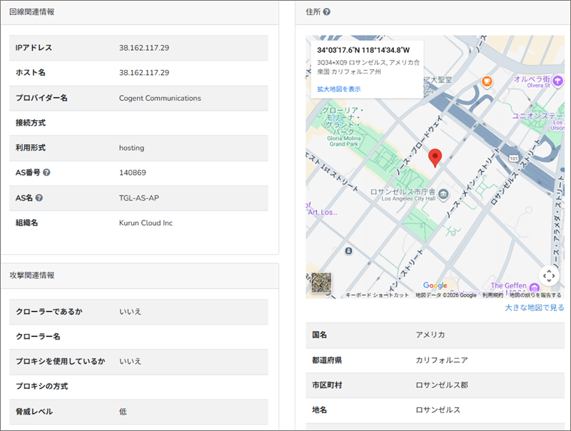 このReceivedフィールドの末尾にあるIPアドレスからメールの発信地を「IP調査兵団」で導き出してみると、ロサンゼルス付近です。