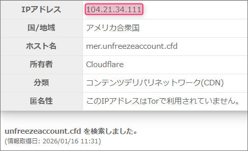 ここに記載されている通り、利用されているプロバイダーは「Cloudflare」のようですが、多くの詐欺サイトで利用されるプロバイダーです。