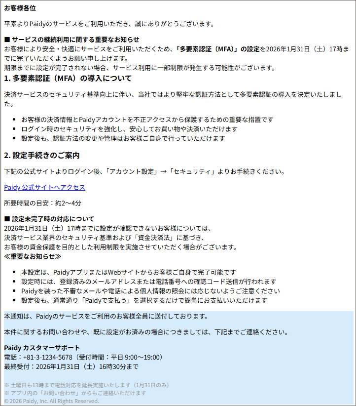 【危険】『【重要】【アクション必須】Paidy:MFA設定のお願い(2026年1月31日〆切)』メール、実例と見分け方