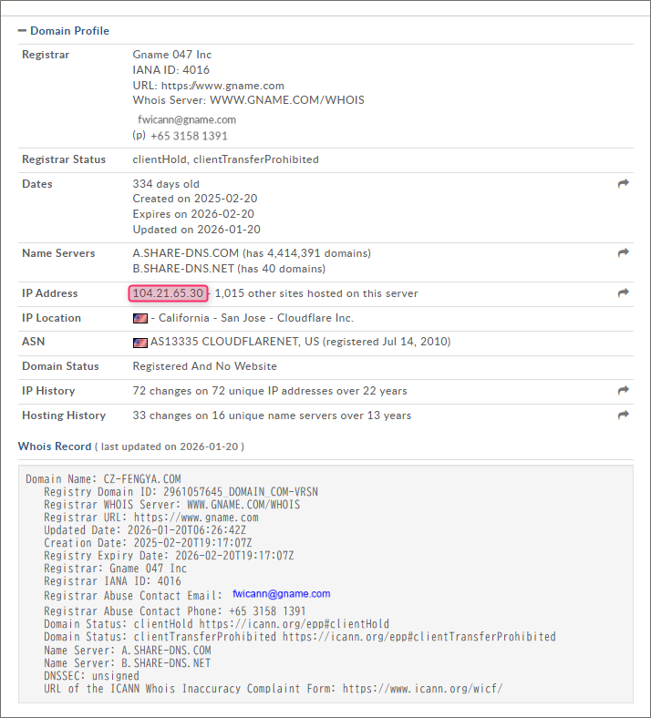 - 不審なドメイン登録: サイトのドメイン(CZ-FENGYA.COM)は、シンガポールの電話番号で登録されており、さらに有効期限が1年のみという「使い捨て」の状態で取得されています。
