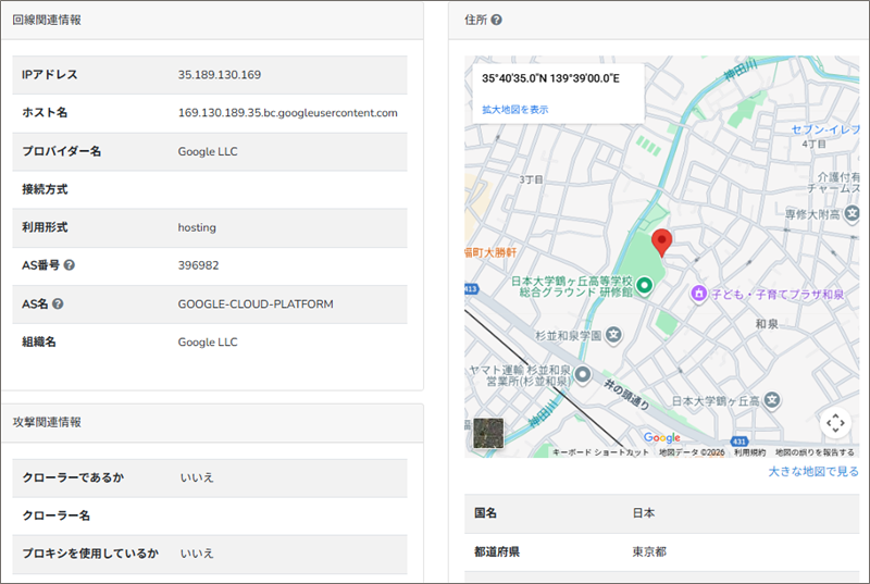 このReceivedフィールドの末尾にあるIPアドレスからメールの発信地を「IP調査兵団」で導き出してみると、東京都杉並区付近です。