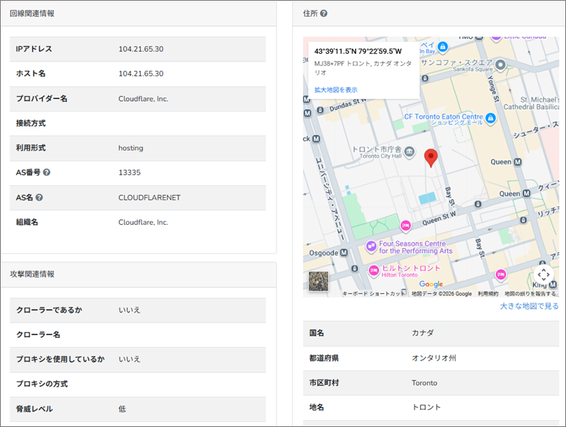 故にここに表示される場所(トロント市庁舎付近)はCloudflareのエッジ拠点に過ぎませんからここに詐欺サイトが設置されているとは限りません。
