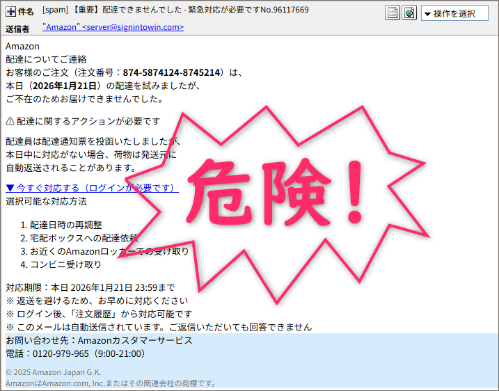 送信者が “Amazon" となっていますが、実際のアドレスが <server@signintowin.com> となっており、Amazonの公式サイト(amazon.co.jp)とは無関係なドメインです。