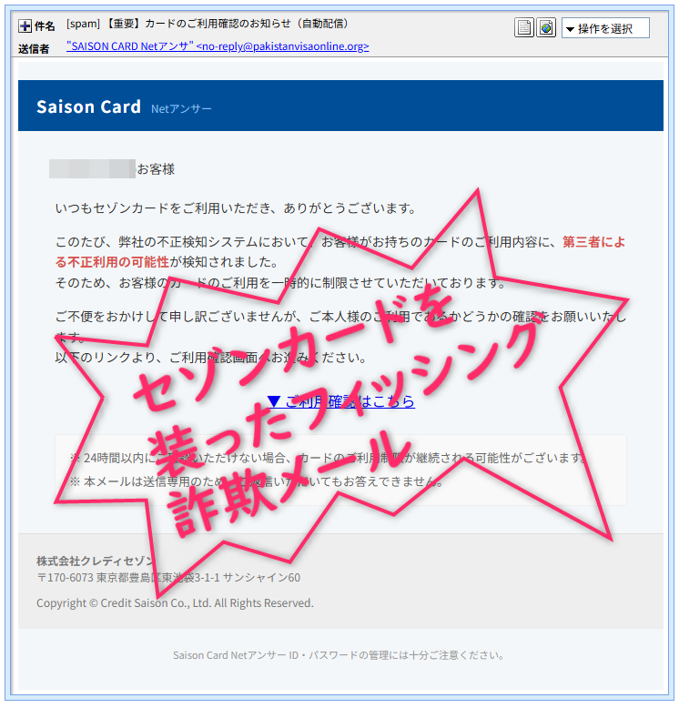 セゾンカード(saisoncard.co.jp など)とは無関係なドメインで、パキスタンのビザ関連ドメインを使うことは絶対にありません。 - 宛名が不自然