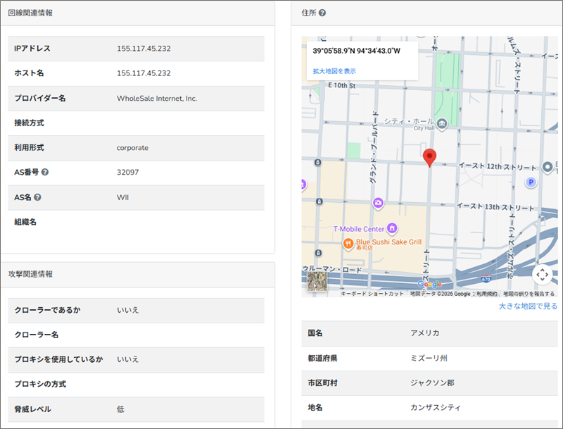 送信元のIPアドレスを解析した結果、サーバーは日本ではなく アメリカ合衆国ミズーリ州カンザスシティ に所在しています。