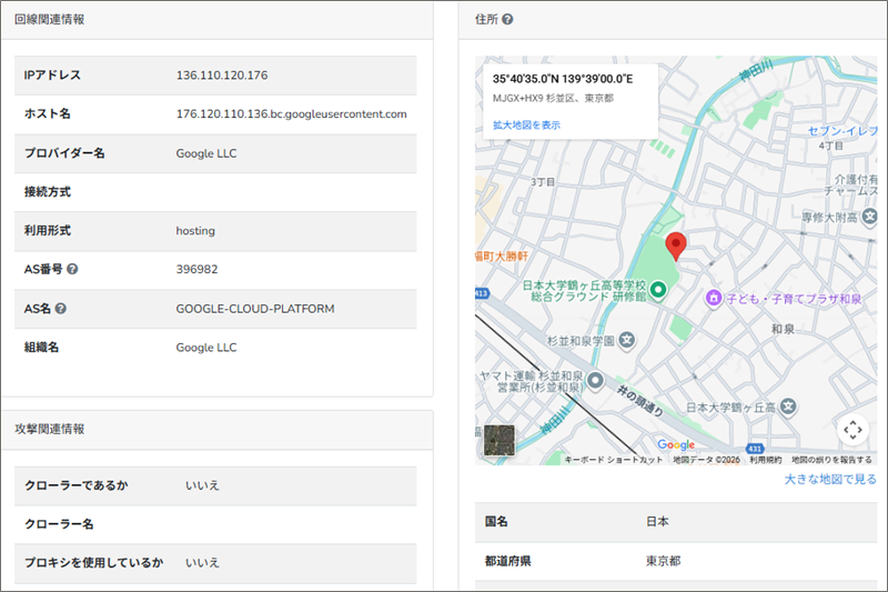 IPデータベースでは東京都内の代表点(例:杉並区・千代田区・港区など)に丸められるので、確かに東京のどこかからではありますが、東京都杉並区付近は実在の送信者の住所ではなく、単なる代表座標地点であると言えます。