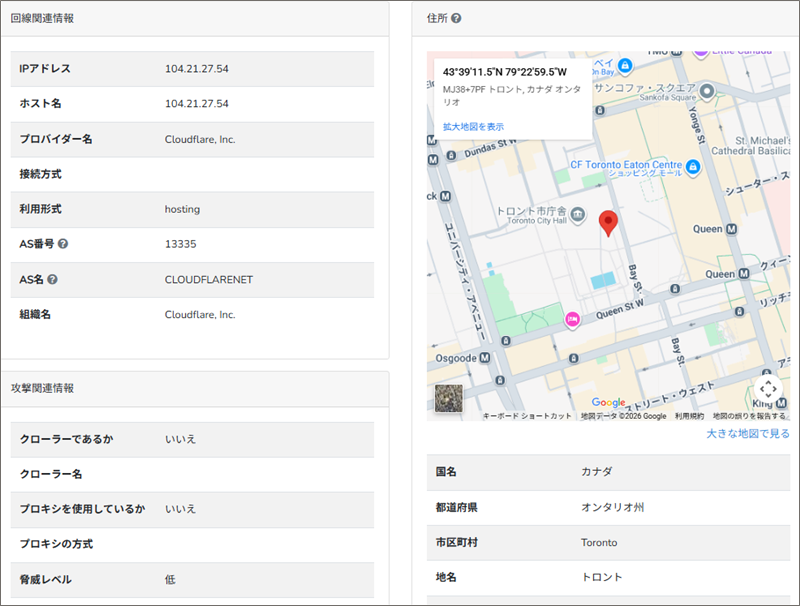 「IP調査兵団」でこのIPアドレスからそのロケーション地域を調べると、カナダのトロント市庁舎付近であることが分かりました。
