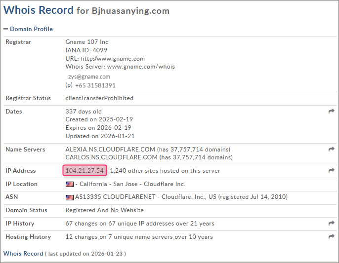 通常本物の金融系の場合、複数年更新で10年以上の運用履歴が普通です。 - 「IP Address 104.21.27.54 – 1,240 other sites hosted on this server」
